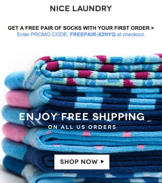 - Rich Delivery: Rich delivery consists of using great typography and rich imagery to entice your subscribers. Our brains process images way more easily than they do text. Things become even more interesting if you use human faces in the emails. Look at the example below, where an eCommerce retailer offers not only free shipping but also free socks.