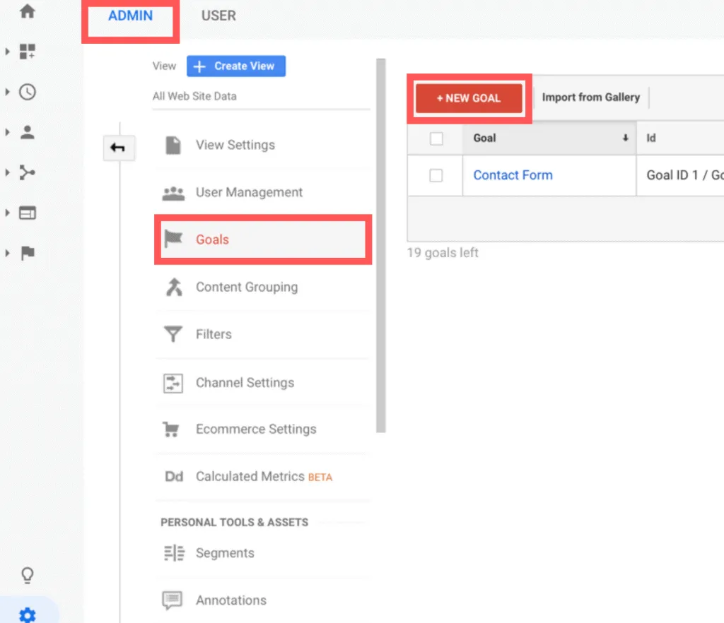 Once you’re in Google Analytics, head to “Admin” at the gear-shift symbol toward the bottom of your page, then click “Goals” in the right-hand menu and select “+ New Goal.”