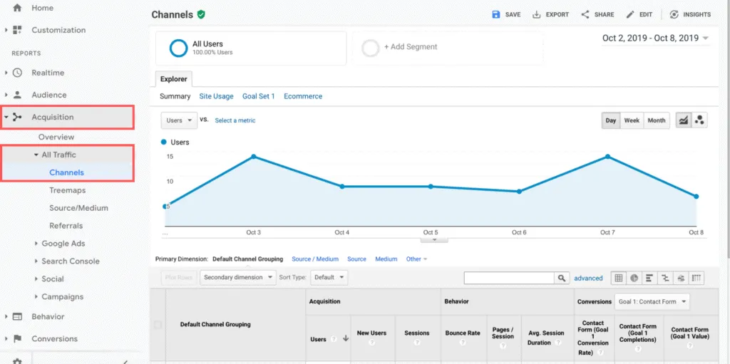 Once your campaigns are being tracked, you can run reports to take a closer look at your metrics. To see an overview, head to the “Acquisition” tab, then select “All Traffic” and “Channels.” You can then view your trends over a day, week, or month, or look toward the bottom of your screen to see your acquisition, behavior, and conversion numbers.