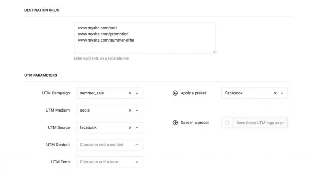 http://www.mysite.com/sale?utm_source=facebook&utm_medium=social&utm_campaign=summer_sale