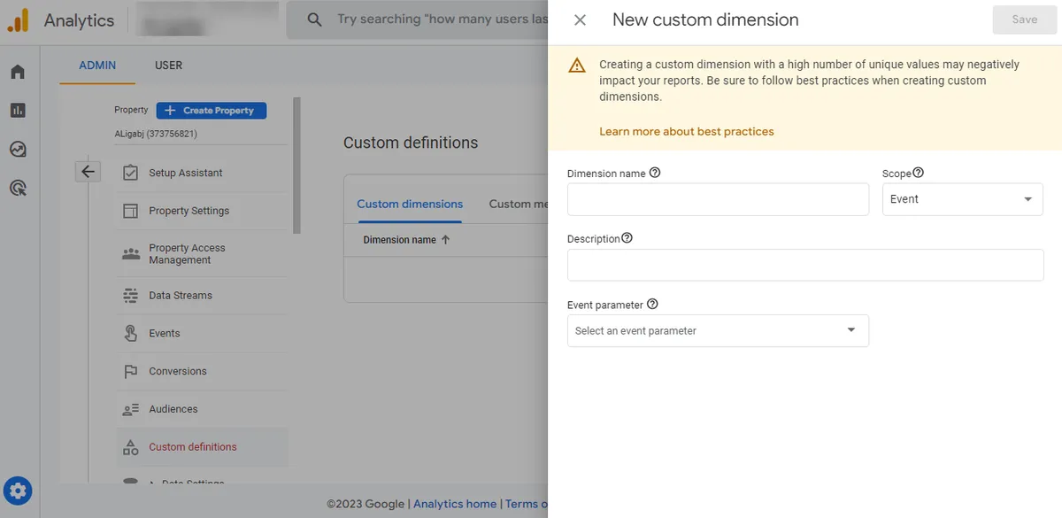 - Fill in the details- dimension name as ‘utm_marketing_tactic’, Scope, Description (optional) and event parameter.